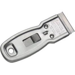 Delta heavy duty glass scraper with 5 blade, large ribbed control button for safer operation, extra firm blade clamp holds blade under scraping pressure, blade is held at 5 degree offset angle to get under paint for improved scraping, large hand hole for convenient storage, remove coatings, paint, stickers from glass & mirrors, uses standard single edge razor blades.