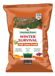 Jonathan Green Winter Survival Fall Lawn Food is the ideal fall lawn fertilizer to spread anytime from early September through mid-November because air temperatures are cooler and the soil is still warm enough for grass roots to grow deep. Winter Survival provides the nutrients to help boost newly seeded lawns as well as help established lawns grow thicker and greener grass with deeper roots.